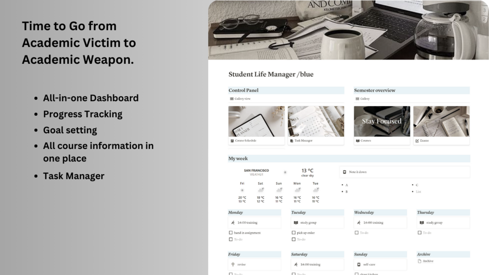 This all-in-one Notion template offers a way to organize, gather and store all the information needed for your academic year and maximum success.